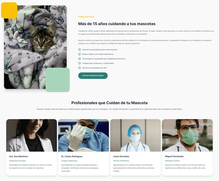 Landing page amigable: mensajes claros, fotos de mascotas obteniendo un servicio, botones estratégicos para incentivar llamada a acción.